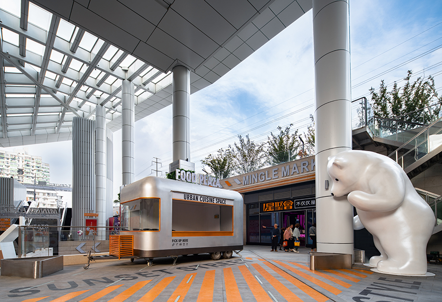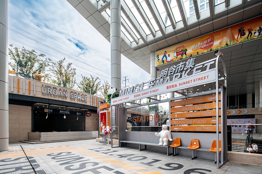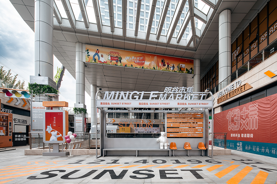 結合車站、斑馬線、紅綠燈等元素打造韓國街頭感,休閑座椅及廣告燈箱的植入讓空間在滿足功能性的同時也提升了拍照打卡性,潮流年輕的色彩也讓空間更具活力。