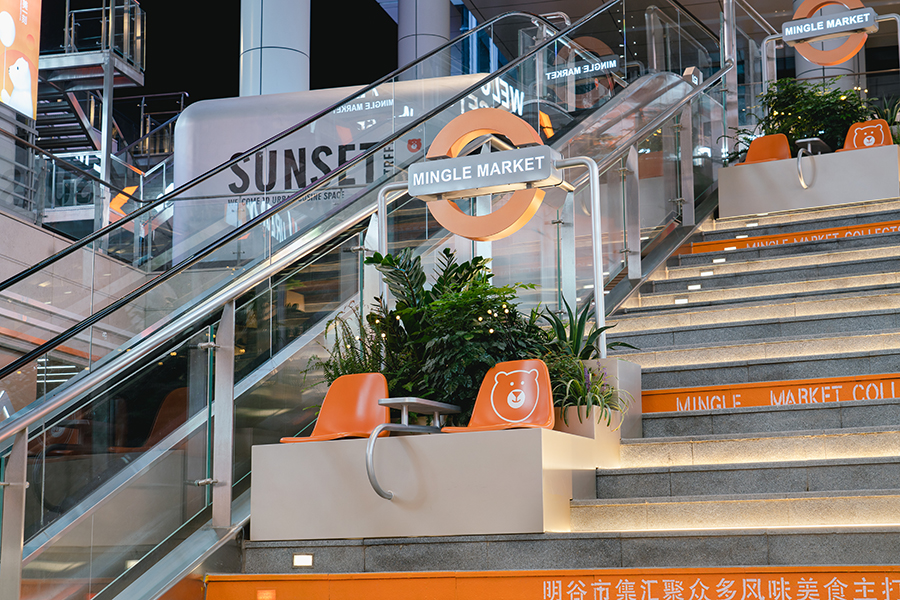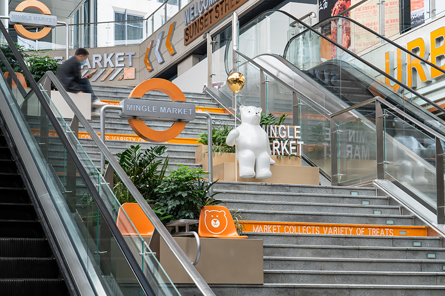 階梯設置看臺式休息區,可以觀賞視頻和休閑打卡,IP的植入也讓空間更具趣味性。