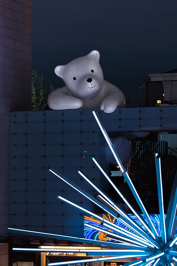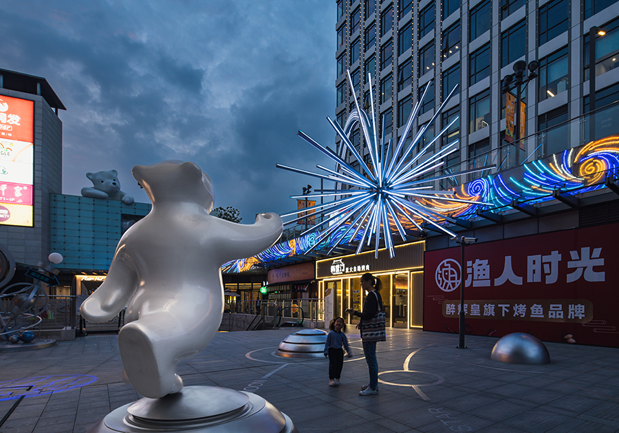 燈光裝置打造門頭,將南廣場IP熊裝置與北廣場玉蘭花裝置相結合,為進入商業街的客流帶來一種別致的儀式感。