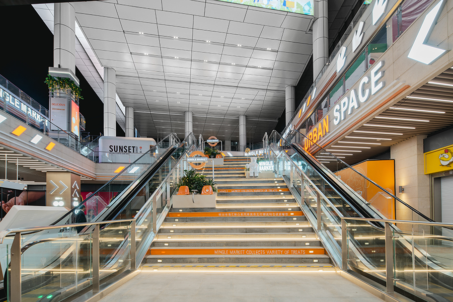 燈光裝置結合地面投影,將整體的夜經濟氛渲染的更加濃烈。步梯增加特色裝置及趣味IP增強步梯的儀式感,星光步梯的植入也讓下沉廣場的燈光氛圍更具層次感。