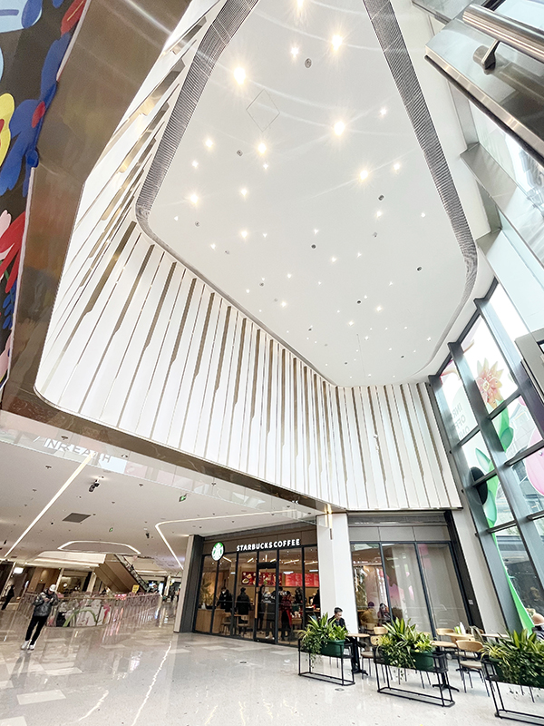 入口空間立面設計使用縱長的弧形白色鋁板,以陣列形式排布,每段中央嵌入金屬條,為立面增加韻律感;天花設計以簡約為主,將一粒粒“種子”演化為特色星空天花,增加細節感;