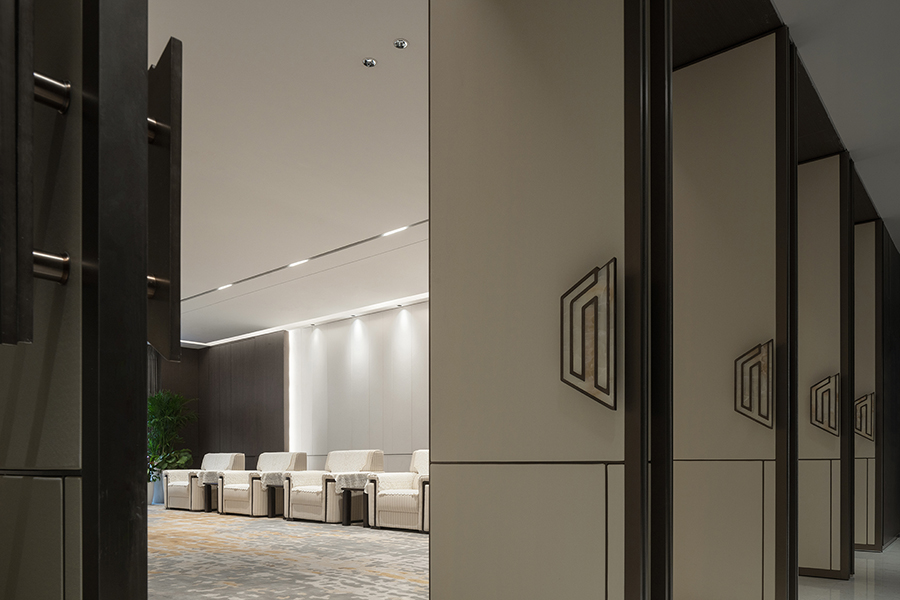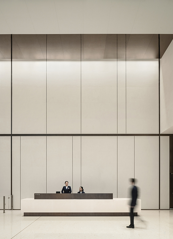 大堂空間簡明的線條代替多余的修飾,打造富有秩序感的高品質大堂。主立面提取“后母戊鼎”鼎身的十字錯拼圖案劃分石材分塊,在整體性中躍動細節韻律的美感。