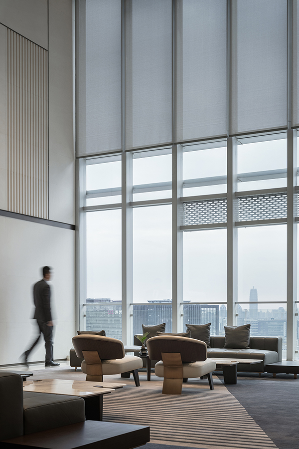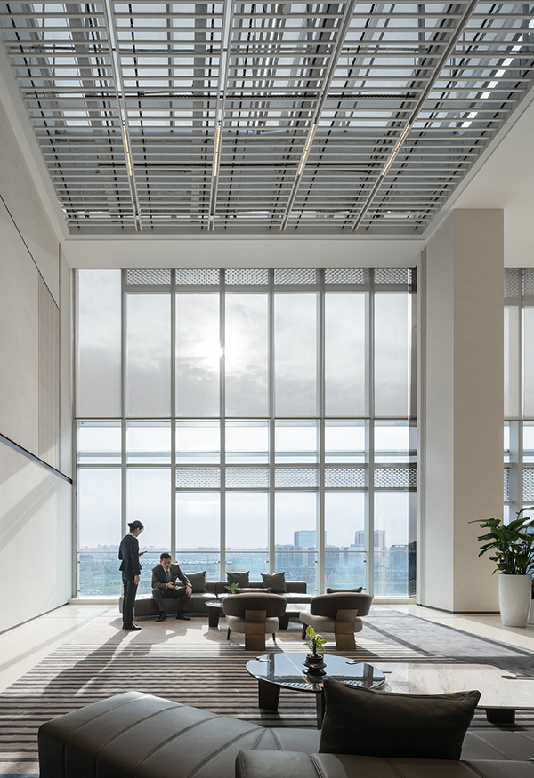 燈光設計延續室內設計“窗”的核心理念,采用不同色溫塑造辦公樓的空間功能,大堂區域采用日光感應不同外部天氣與時間變化來設置不同模式。標準過道、會議室、培訓室等區域通過智能場景照明控制,實現不同時段的照明功能和氛圍需求,兼顧靈活性與實用性。