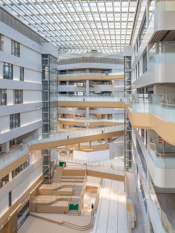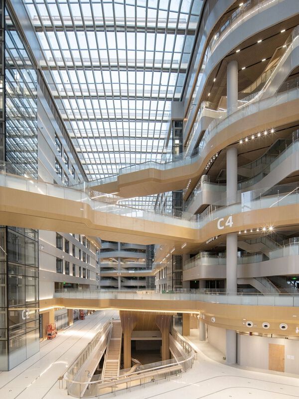 J&A杰恩設(shè)計以“自·然·界”概念的宏觀命題作為設(shè)計主題,辦公中庭分主題概念高峽通衢運用莫比烏斯環(huán)的空間形態(tài)打造無限循環(huán)連廊,為阿里巴巴打造出一座集政務接待、國際會晤、創(chuàng)新研發(fā)、休閑娛樂為一體的超大復合型辦公總部。