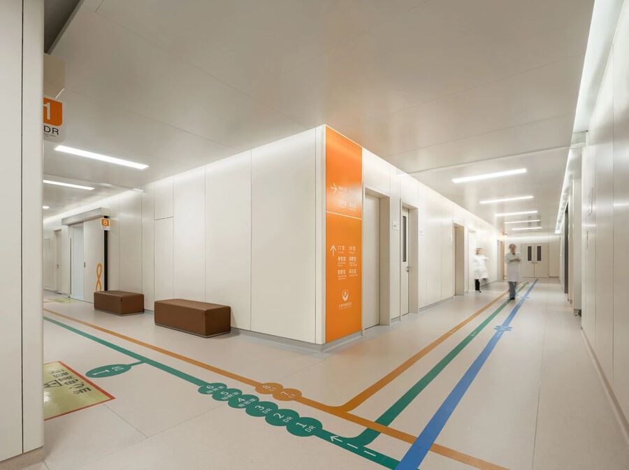 考慮到醫(yī)技區(qū)域內(nèi)部裝修材料需具備耐用性,J&A選用耐磨損、抗化學(xué)腐蝕的材料,以適應(yīng)醫(yī)院消毒劑等化學(xué)物質(zhì)的頻繁使用。