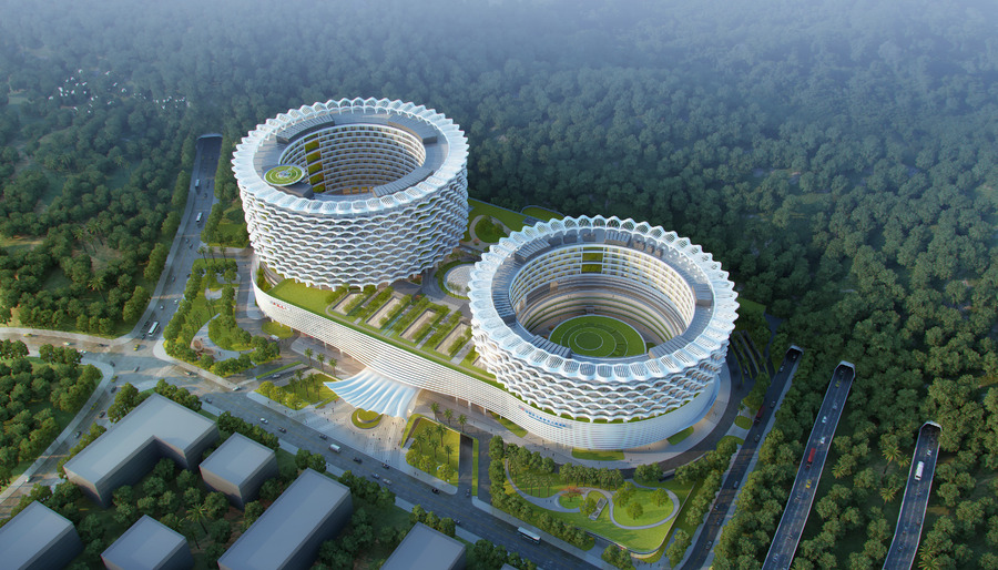 在團(tuán)隊(duì)討論的過(guò)程中,設(shè)計(jì)主創(chuàng)孟建民院士突然迸發(fā)靈感。他憑借著直覺(jué)和經(jīng)驗(yàn),寥寥幾筆迅速勾勒出了一張概念草圖:兩個(gè)圓形的塔樓被共同的基座托舉起來(lái),形成了一個(gè)生動(dòng)的“生命之環(huán)”。