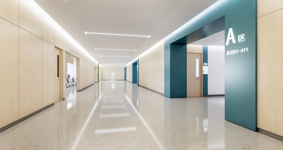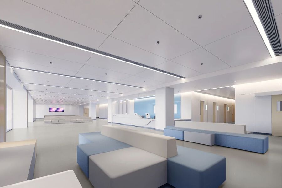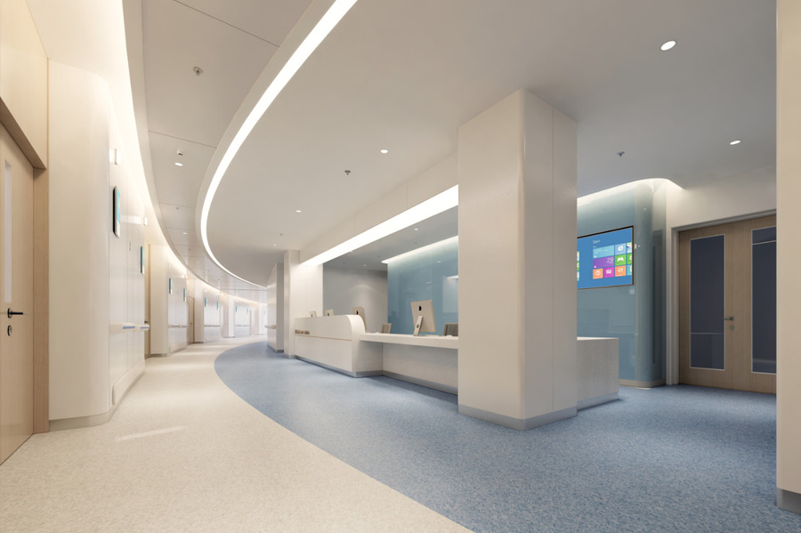 如此關(guān)于細(xì)節(jié)的考量還有很多。諸如室內(nèi)所有的桌面都做了倒圓角處理,避免醫(yī)療空間中有太多的鋒利感讓病患產(chǎn)生抵觸情緒;照明設(shè)計(jì)部分,常規(guī)的門(mén)診采用4000~4500k的冷光源,而康復(fù)科室則采用約3000k的暖光源,并且盡量使用發(fā)光軟膜或者燈帶等漫反射光源,避免筒燈等直接照明對(duì)視覺(jué)造成刺激,也讓整個(gè)空間舒緩下來(lái)。