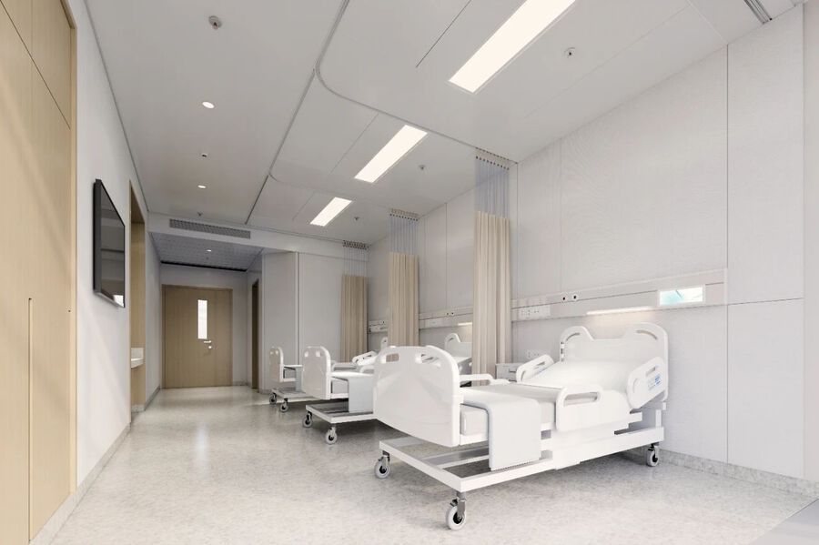 這種正向的反饋與人本設(shè)計(jì)也同樣發(fā)生在室內(nèi)精裝的設(shè)計(jì)與施工上,充分體現(xiàn)了對(duì)醫(yī)務(wù)工作者與病患的雙重關(guān)懷。例如,市二醫(yī)院的醫(yī)務(wù)人員反映,常規(guī)醫(yī)院裝修中采用的石膏板有著很明顯的弊端——容易發(fā)霉,同時(shí)也容易被日常使用的試劑所浸染,留下無(wú)法清除的痕跡。他們提出,希望可以在大鵬人民醫(yī)院的裝修過(guò)程中,嘗試使用新型抗菌、抗潮、抗霉的材料。從使用者出發(fā),這樣的訴求也倒逼著深圳的裝飾材料領(lǐng)域去不斷探索、研發(fā)。