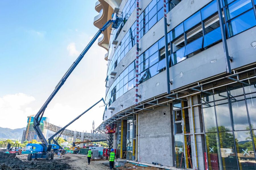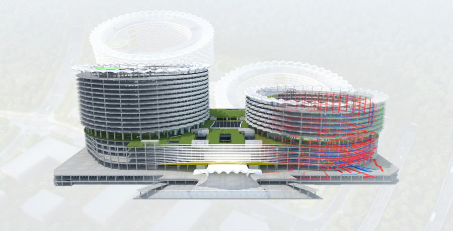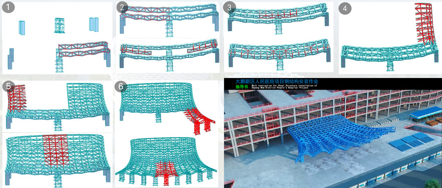 這樣盡職的態(tài)度,也促成了項(xiàng)目上很多創(chuàng)新點(diǎn)的出現(xiàn)。例如,按照原先的設(shè)計(jì)方案,建筑造型應(yīng)全部采用混凝土結(jié)構(gòu),但是經(jīng)過(guò)BIM技術(shù)模擬,對(duì)各方的安全性進(jìn)行綜合比對(duì)和評(píng)估后,建議將屋面調(diào)整為鋼結(jié)構(gòu)。經(jīng)由多方商討,最終這一建議被采納,以保證項(xiàng)目整體的安全性。加之本項(xiàng)目是裝配式醫(yī)院,因此地下兩層與地上五層為鋼筋混凝土結(jié)構(gòu),而五層以上(包括南塔屋頂?shù)闹鄙龣C(jī)停機(jī)坪,以及外立面的飄帶和裙房上的飄板)均采用全鋼結(jié)構(gòu),大鵬人民醫(yī)院也由此成為深圳市建筑工務(wù)署建設(shè)管理醫(yī)院中第一家運(yùn)用鋼結(jié)構(gòu)的醫(yī)院。