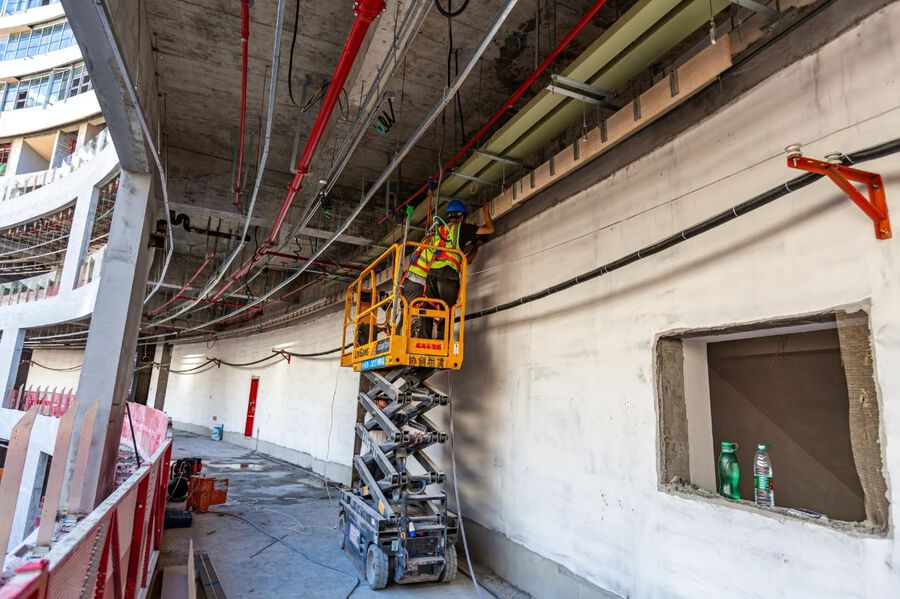 大量的弧形設(shè)計(jì)賦予了大鵬人民醫(yī)院建筑獨(dú)特的韻律和動(dòng)感,然而,這也使得建筑整體結(jié)構(gòu)變得更加復(fù)雜。從主體結(jié)構(gòu)到機(jī)電管線安裝,再到后續(xù)的醫(yī)療專(zhuān)項(xiàng)和設(shè)備進(jìn)場(chǎng),弧形的作業(yè)面給施工帶來(lái)了極大的挑戰(zhàn)。作為專(zhuān)業(yè)性極高的醫(yī)療建筑,大鵬人民醫(yī)院涉及非常多專(zhuān)業(yè)和部門(mén)。