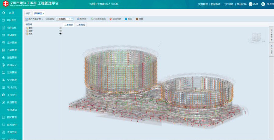 為此,通過(guò)數(shù)字賦能,大鵬人民醫(yī)院項(xiàng)目全周期地運(yùn)用了BIM技術(shù),從前期準(zhǔn)備階段到施工階段,再到調(diào)試階段和竣工驗(yàn)收階段,都通過(guò)數(shù)字化模擬的方式,對(duì)項(xiàng)目的施工進(jìn)度和施工質(zhì)量加以管控。除了BIM技術(shù)的綜合運(yùn)用,項(xiàng)目還打造了智慧工地指揮中心,結(jié)合云計(jì)算、AI等技術(shù),通過(guò)指標(biāo)指數(shù)、雷達(dá)圖、分布圖、熱力圖等可視化手段,讓“摸不著”的數(shù)據(jù)“看得清”,實(shí)現(xiàn)項(xiàng)目建設(shè)全過(guò)程數(shù)據(jù)自動(dòng)采集、智能分析和預(yù)警。