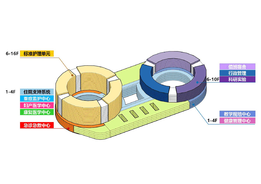 整個(gè)建筑體的中央是醫(yī)院的核心,為“樞紐之庭”。這個(gè)區(qū)域是公眾進(jìn)入醫(yī)院的第一站,他們通過(guò)主入口進(jìn)入這里,接受門(mén)診治療和醫(yī)技檢查。北面的塔樓較高,為醫(yī)院的住院樓,其中央的圓環(huán)里設(shè)有一個(gè)開(kāi)放的空間,被稱(chēng)為“生命之庭”。它是一個(gè)露天的庭院,其中置入名為“生命之樹(shù)”的應(yīng)用裝置,利用光導(dǎo)技術(shù)將自然光引入其中,創(chuàng)造出極具療愈感的建筑空間。南面的環(huán)形建筑樓層較低,被用作行政樓,其中庭圍繞科研和教學(xué)交流,布置有圓形學(xué)術(shù)交流廳,因此被命名為“交流之庭”。這個(gè)空間旨在促進(jìn)醫(yī)學(xué)合作和知識(shí)分享,為醫(yī)療科研和教學(xué)提供一個(gè)開(kāi)放和溫馨的環(huán)境。合理的功能分區(qū)營(yíng)造出了舒適、有益健康的環(huán)境,自然的療愈力量亦能夠促進(jìn)身心的健康。