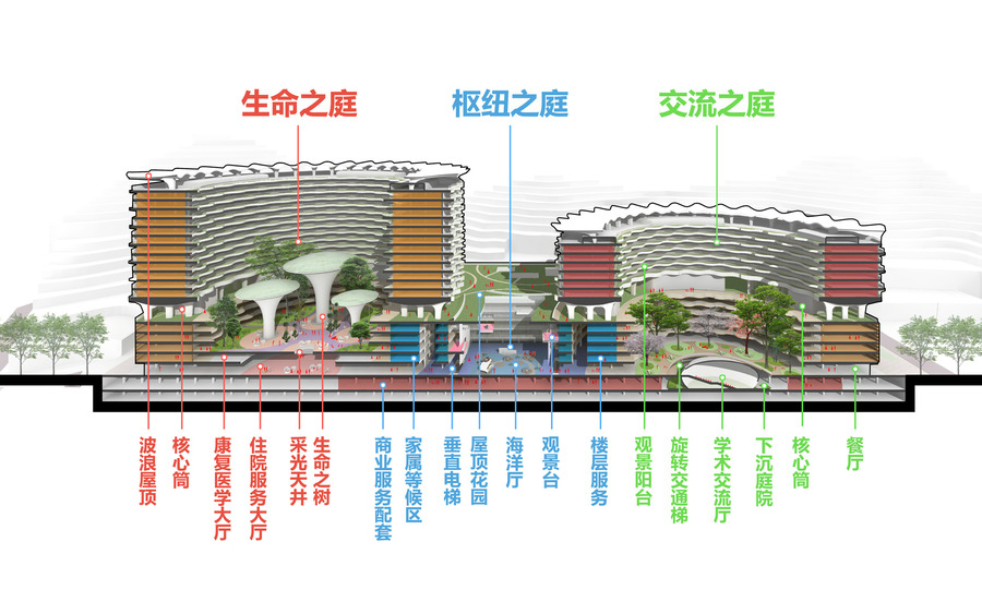 在這一新的組織結(jié)構(gòu)中,基本醫(yī)療中心位于場(chǎng)地中央,包含門(mén)診和醫(yī)技功能,為醫(yī)院的核心部分。醫(yī)療支持中心和特色醫(yī)療中心分置于南北兩側(cè)塔樓。這樣的布局使得三大中心相對(duì)獨(dú)立,同時(shí)通過(guò)拓?fù)鋷缀巫兓瑒?chuàng)造出三個(gè)獨(dú)具療愈文化特色的中庭空間,分別為“樞紐之庭”“生命之庭”和“交流之庭”。