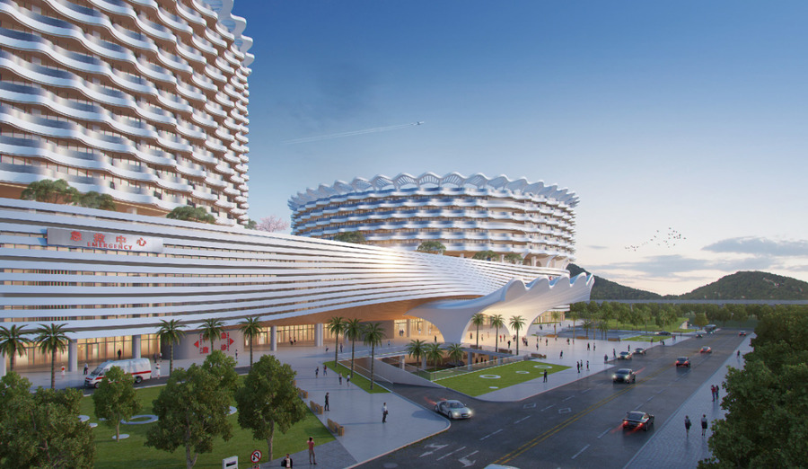 從造型來(lái)看,大鵬人民醫(yī)院顛覆了人們對(duì)于傳統(tǒng)醫(yī)院的固有印象。兩棟圓形塔樓一高一低,懸浮于裙房基座之上,形成一個(gè)完整的有機(jī)體。塔樓外圍延伸出連續(xù)波浪形的水平陽(yáng)臺(tái),上下旋轉(zhuǎn)錯(cuò)動(dòng),宛若起伏的海浪;主入口處,尺度恢弘的雨棚恣意延伸而出,懸挑達(dá)25m,仿佛剛剛從海面上升起的貝殼,充滿靈動(dòng)氣息。這些細(xì)節(jié)賦予了醫(yī)院獨(dú)特的海濱氣質(zhì),同時(shí)體現(xiàn)了其作為康復(fù)醫(yī)院的理念,挖掘醫(yī)療功能和文化內(nèi)涵,創(chuàng)造獨(dú)一無(wú)二的療愈體驗(yàn),使其成為國(guó)內(nèi)最具特色的醫(yī)療服務(wù)目的地之一。