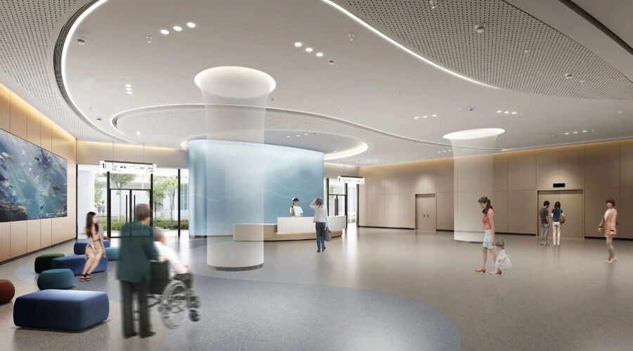 深圳市大鵬新區(qū)人民醫(yī)院,是深圳市建筑工務(wù)署第一座鋼結(jié)構(gòu)醫(yī)院項(xiàng)目,由深圳本土建筑大師、中國(guó)工程院院士孟建民主持設(shè)計(jì),J&A杰恩設(shè)計(jì)負(fù)責(zé)室內(nèi)設(shè)計(jì)部分。兩棟高低錯(cuò)落的圓形塔樓懸浮于裙樓之上,并與裙樓基座融為一體,寓意為“療愈之環(huán)” 、“韻律之環(huán)”、“生命之環(huán)”。J&A根據(jù)項(xiàng)目本身的功能性以及景觀、建筑特色,以“海洋的奧秘”與“環(huán)環(huán)相扣,生生不息”為設(shè)計(jì)主題,共同打造出一所融合醫(yī)療、科研、預(yù)防保健和康復(fù)療養(yǎng)等功能大型綜合醫(yī)院。