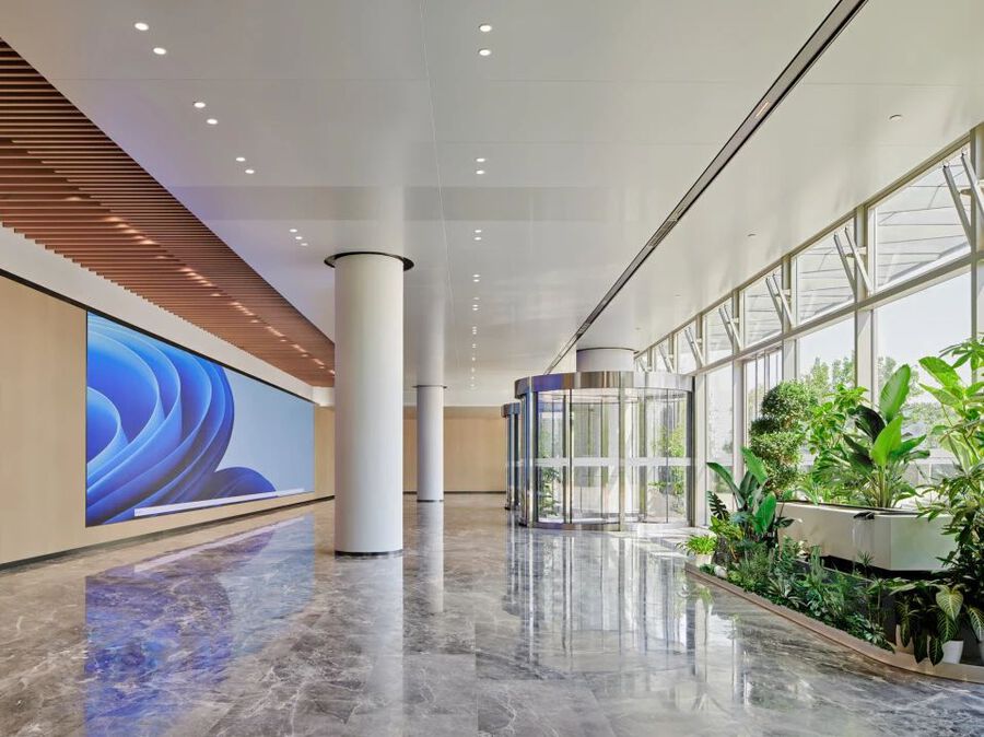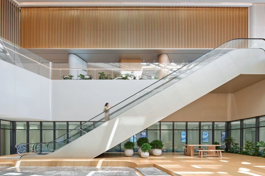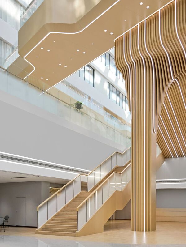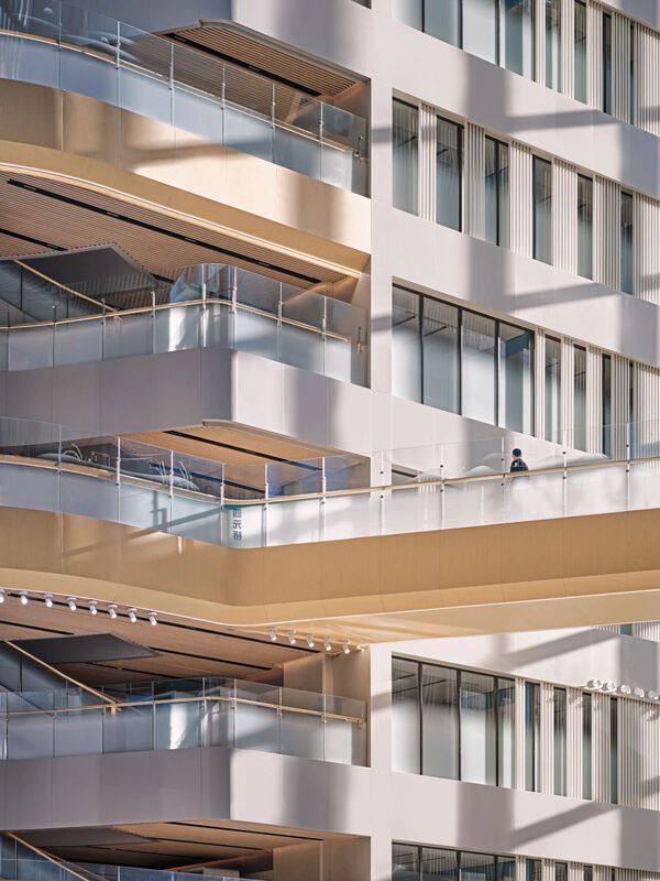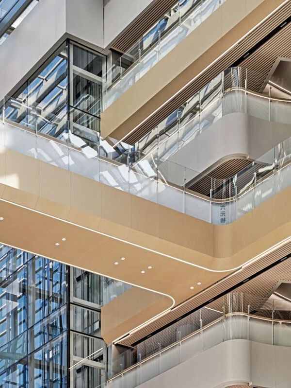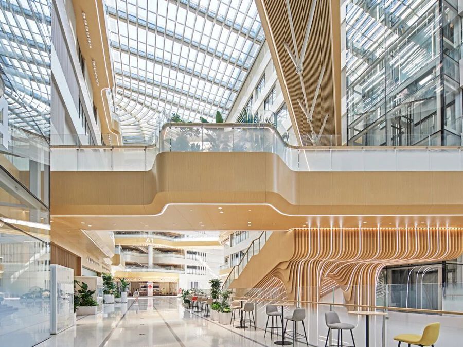 設計團隊利用各樓層本身的建筑曲線,在外立面層疊使用再生木材及鋁板,溫暖的木色和銀色科技感層層交疊,大量綠色植被的引入為空間賦予自然氣息,實現了溫暖、自然與科技的美學共生。