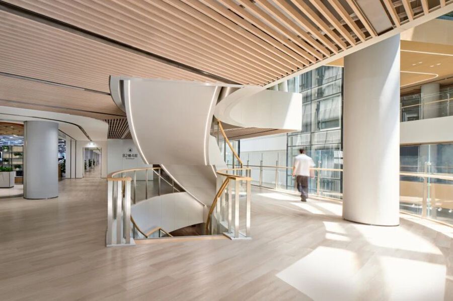 「設計團隊從莫比烏斯環中汲取靈感,打造無限循環連廊,高效連通各層辦公區域及休閑協作空間的動線,同時也增加了空間形態的多樣性和物理位置上的靈活性。」