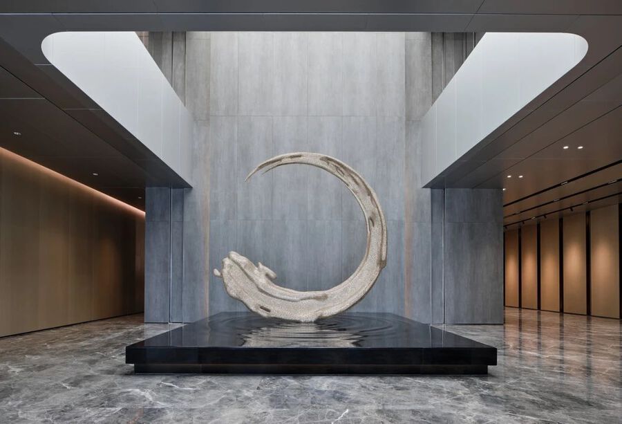 訪客區背景墻“圓融無極”的雕塑裝置設計,猶如一股凝聚的力量,形成了整個VIP接待區域有記憶點且有動感生命力的精神力量。