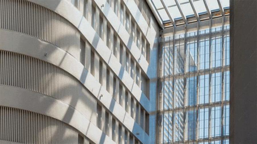 由于三棟建筑體塊矩陣式聯動的特殊性,形成三個形態各異的八層高中庭,如同彼此遙望的高峽,孤獨矗立在不同的面向。