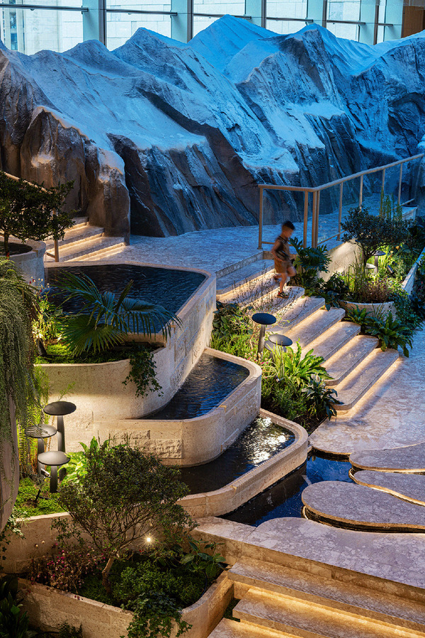 設計團隊從“貢嘎雪山”中汲取靈感,運用山石、疊瀑、森茂三重意象,將一座雪山縮影置于其間,營造了一座具有成都氣質、細膩柔美的山林景觀。