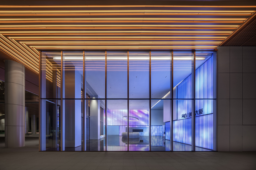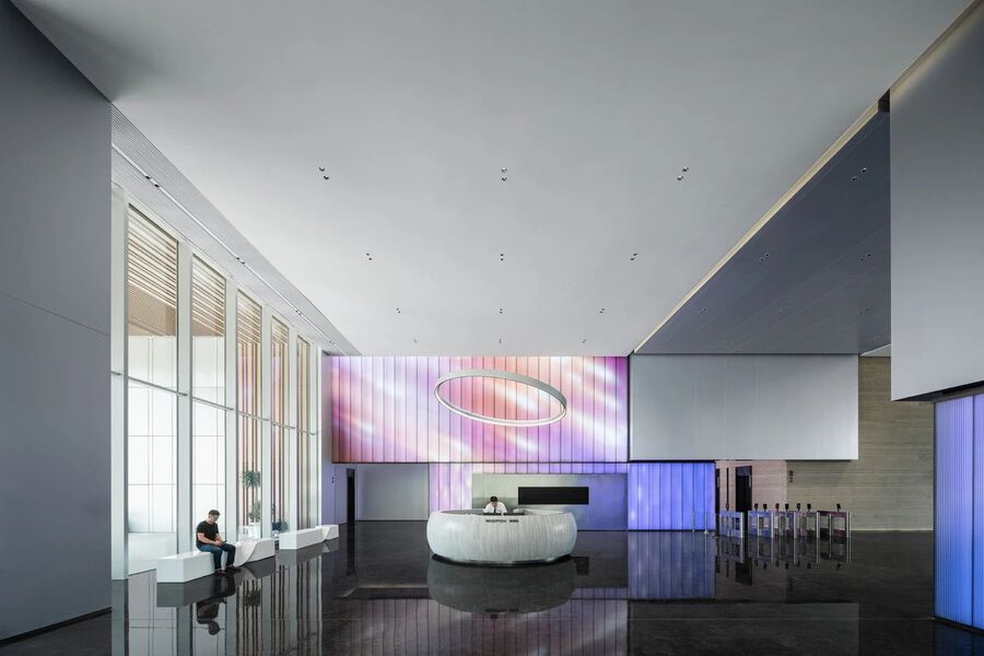 步入大堂后,由朦朧輕快的聚碳酸酯板構成的“光立方“映入眼簾,同時J&A引入智能化管理系統,通過軟件控制燈光,實現立面效果的智能化、多樣化,創造沉浸式的光影體驗