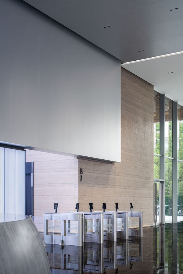 以視覺感官為初,觸達身心深處,首層入口門廳大面積玻璃幕墻形成一個通透的玻璃體塊,將環境與人一同迎入室內。內外空間的界限被模糊,陽光、空氣得以在此流動。