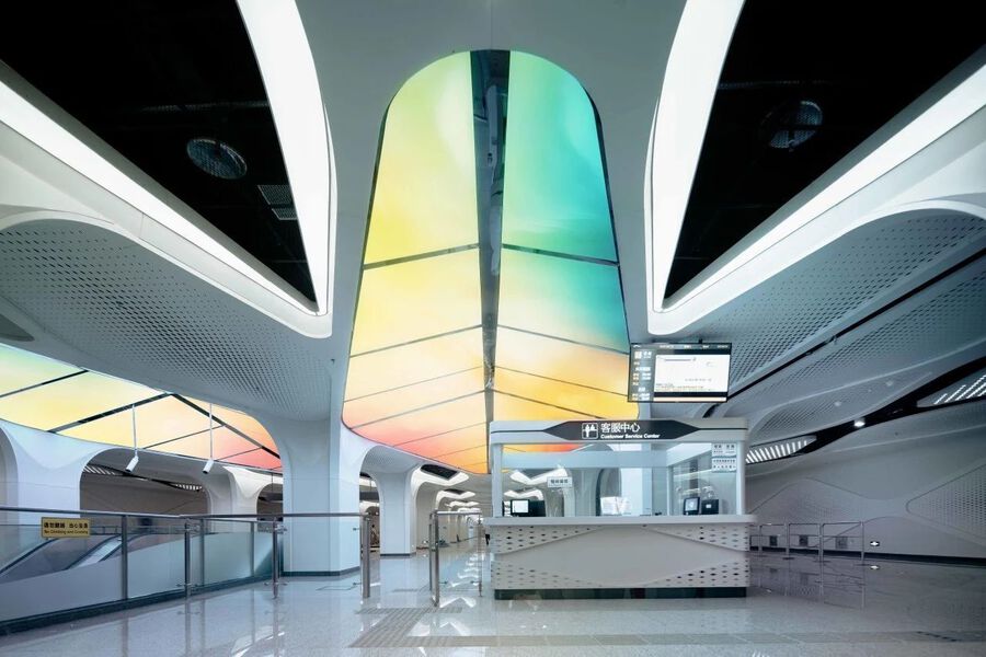 以天府新城站為例,站點整體設計將“藝術”與“科技”的結合發揮到了極致。站點采用智能多彩燈光控制,根據不同時間段,燈光每20秒進行相應的漸變切換,營造出晨昏日出日落的云彩和天色,使人行走在地下空間依然能感受到戶外的五彩白晝。