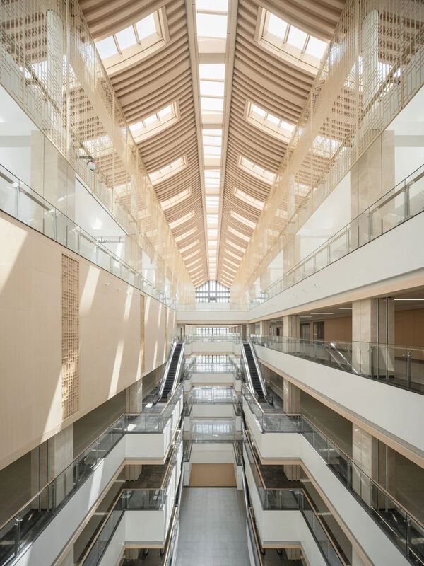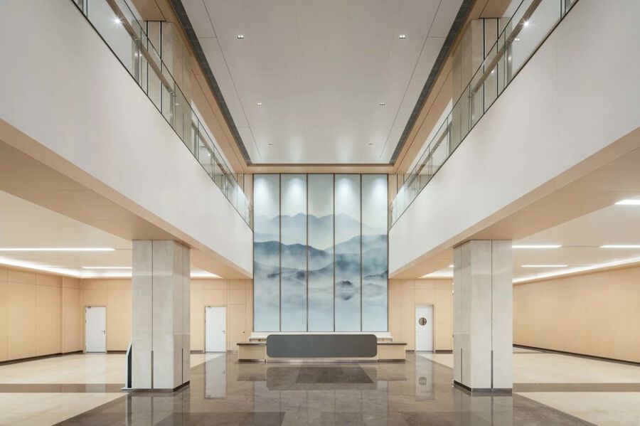 J&A從中式山水墨畫、傳統裝飾中汲取養分,使人們自走入醫院主大堂起,便感受到濃厚的傳統文化氛圍。主大堂兩側借鑒中國傳統畫九重山的形態,連綿起伏的山脈展現出沉穩寬厚的氣質。設計團隊將中醫的智慧和理念貫穿室內設計,讓患者在就醫過程中不僅能得到身體的治療,更能感受到心靈的撫慰和文化的滋養。