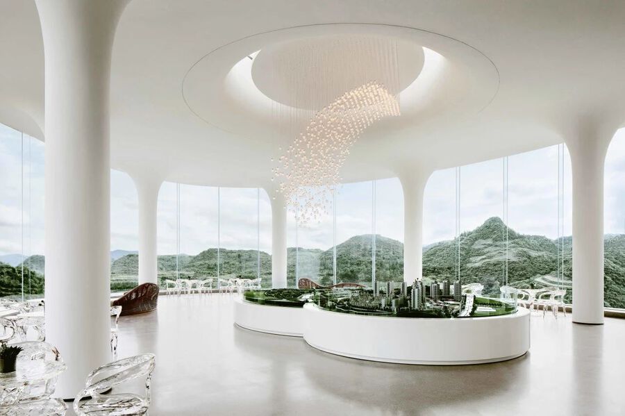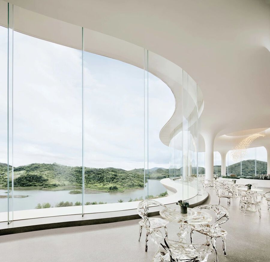 懷著對自然的敬畏與熱愛, J&A以“云藝術館”為設計理念,衍生出“漫步云端”的設計概念,結合當地“云霧,山川,湖泊”等自然文化元素,使建筑、人文、自然三個維度相互融合和襯托。通過運用穿插、解構、曲線感的藝術設計手法,設計團隊打造了一個與生活并行的通透、流動的藝術展示空間。