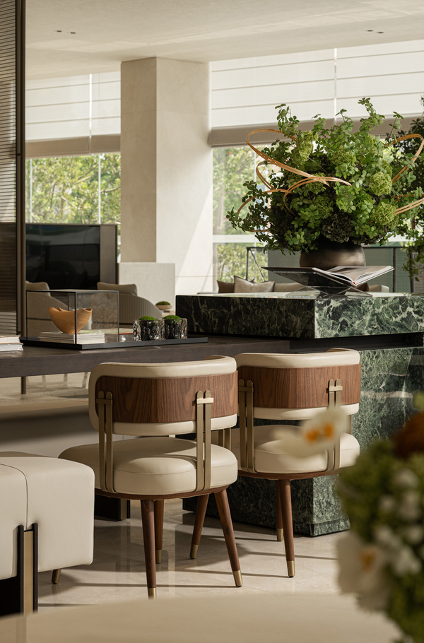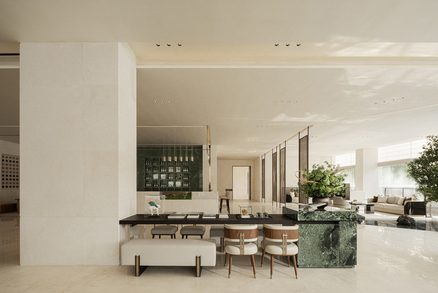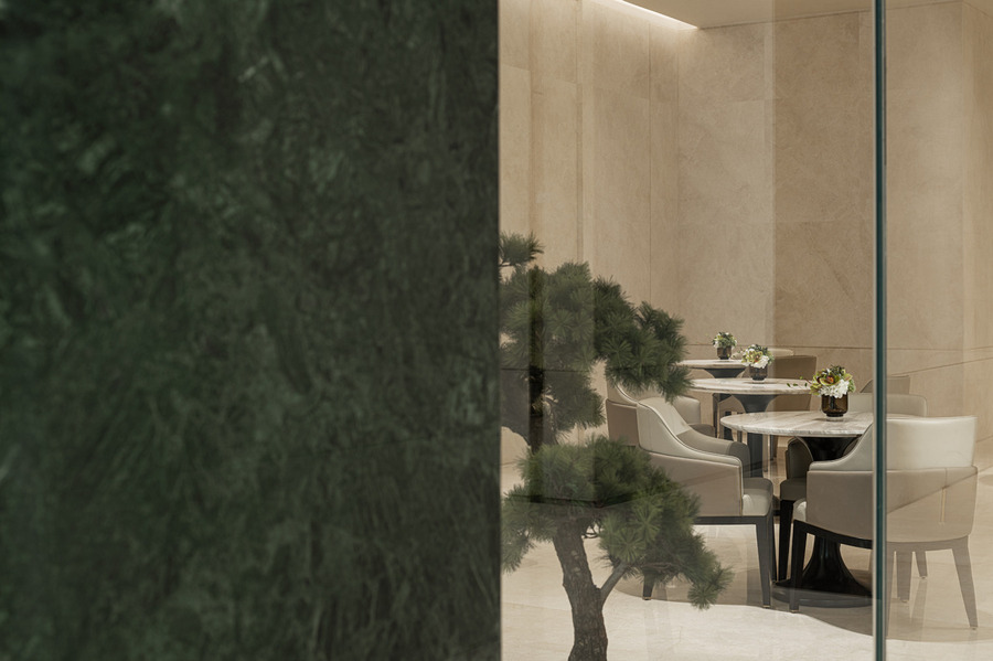 吧臺背景選用綠色奢石營造有序的的空間氛圍,空間局部則點綴了擁有潤澤質(zhì)感的透光玉石。關(guān)于玉石,山賦予了它堅實的身體,水雕琢了它流暢的形態(tài),它們是山水精神的另一種詮釋,在燈光映襯下,熠熠生輝。