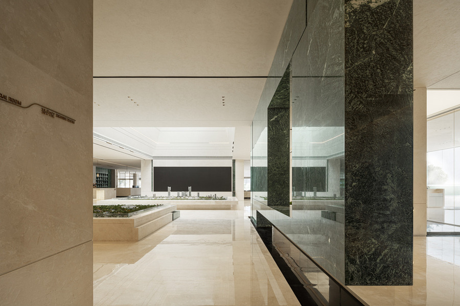 J&A在品牌展示區(qū)到沙盤區(qū)之間植入了一條園林洄游動線,在起承轉(zhuǎn)合中強化場景體驗感。懸挑的綠色奢石造型背景,將人的視線自然引導(dǎo)至沙盤區(qū),人們在漫步中細(xì)細(xì)感受東方園林的深邃與雅致。