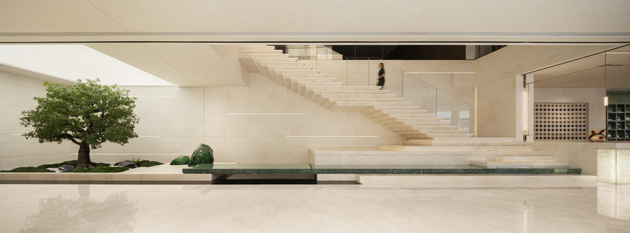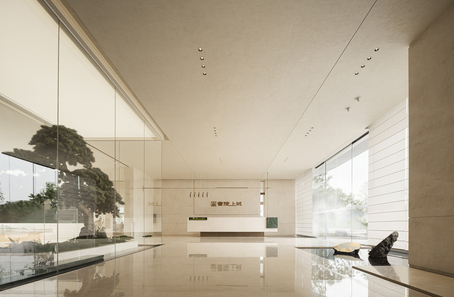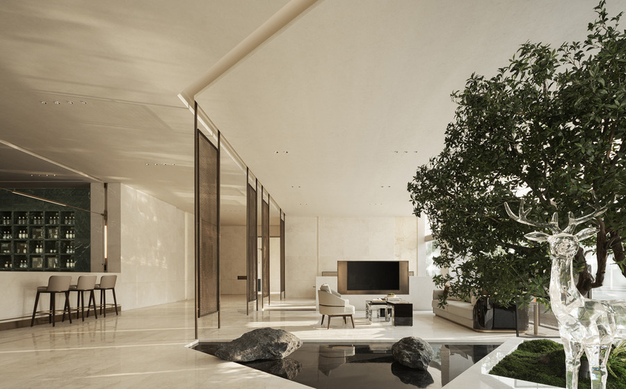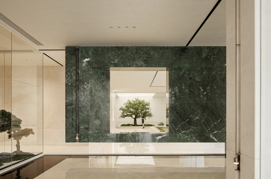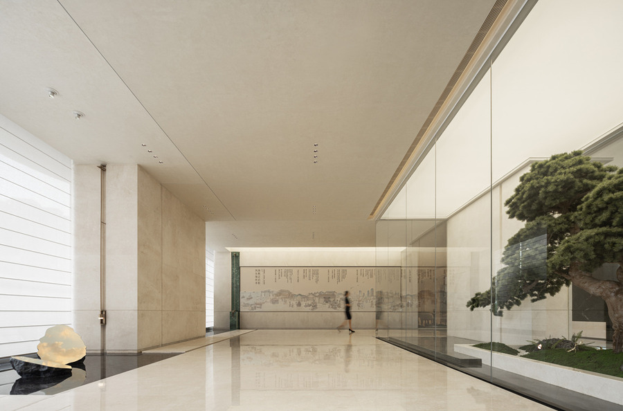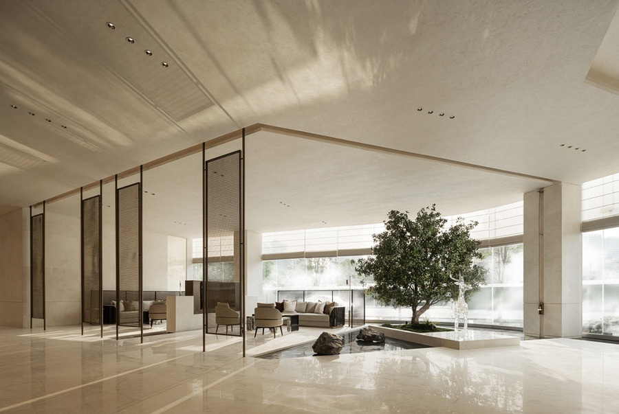 前廳以山水意象為主導(dǎo),占據(jù)空間核心,入口流動的水景營造柔和清新的氛圍,枝干分明的松樹則展現(xiàn)了堅毅自由的姿態(tài)。剛?cè)岵?jì)下映射出深遠(yuǎn)的文化底蘊和歷史記憶,讓人在現(xiàn)代與古典之間感受到深刻的情感共鳴。