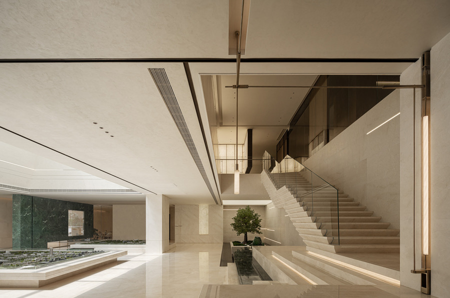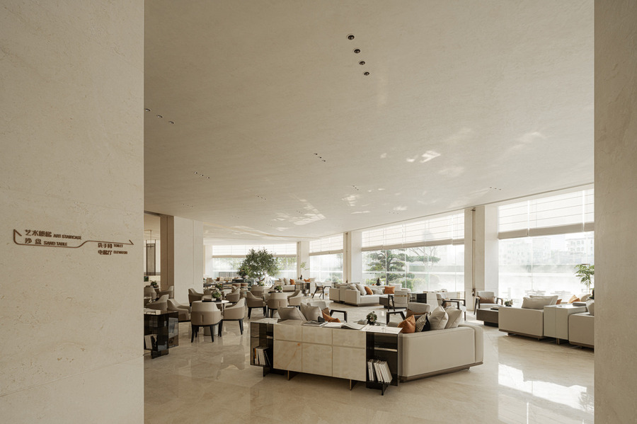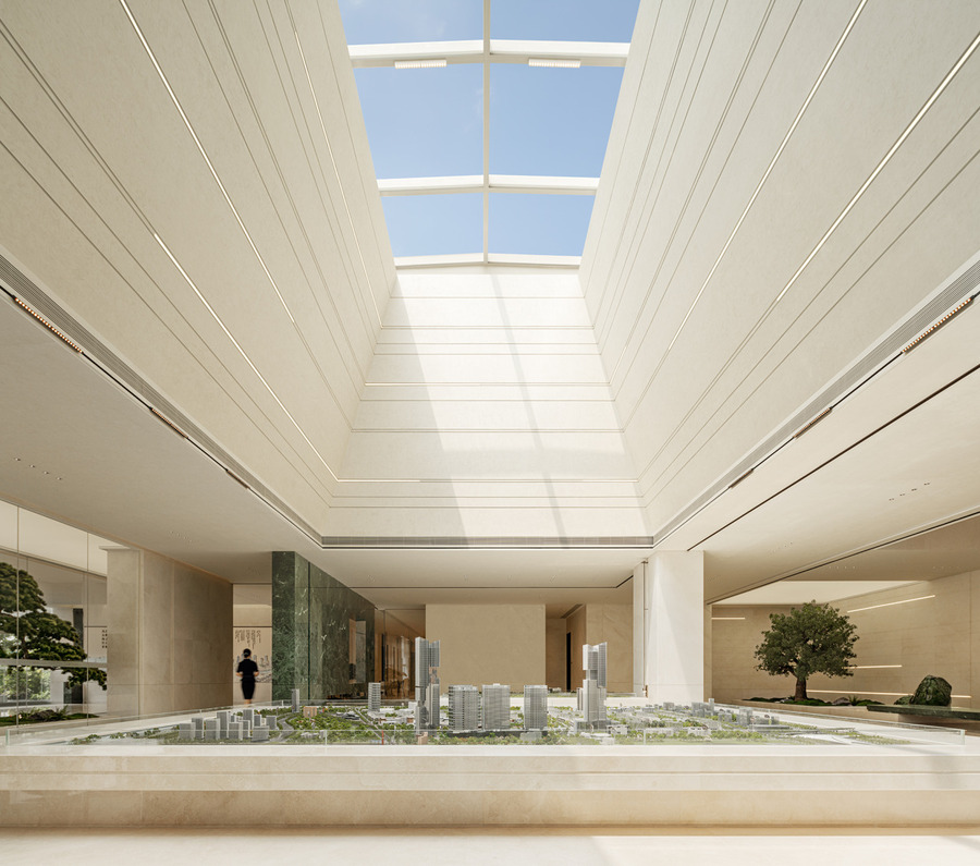 步入沙盤區(qū),映入眼簾的是雙層挑高的空間設(shè)計,二樓頂部的天窗將自然光引入室內(nèi),使得整個空間沐浴在柔和的光影之中。在這里可以隨著時間的流逝,捕捉到日光的變幻與游移,感受光影與空間交織出的美妙旋律。