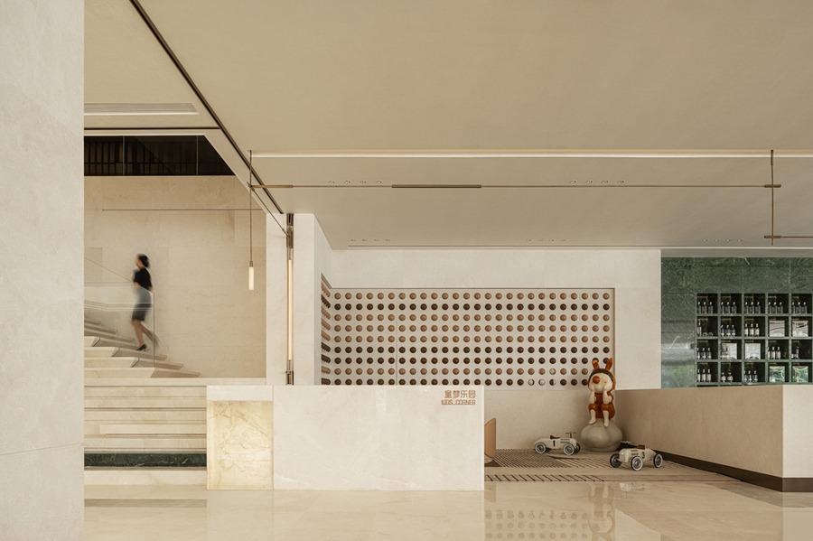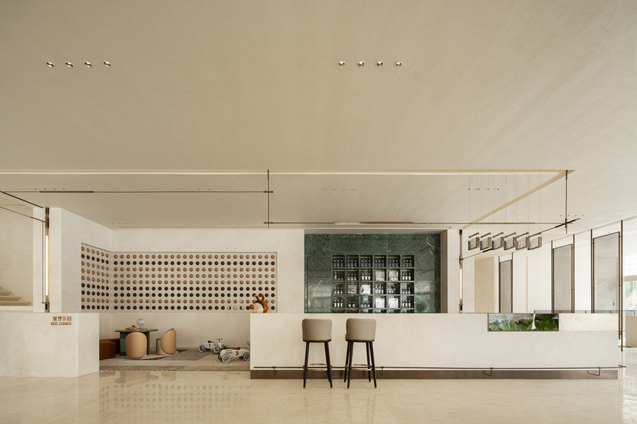 兒童區(qū)以抽象化的意象為設(shè)計語言,運用棕白兩種色彩相間搭配,營造既充滿趣味又富有互動性的空間。