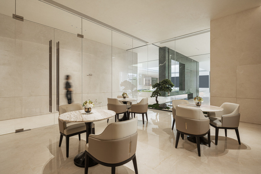 深度洽談區(qū)地面以水而隔,立面采用金屬網(wǎng)屏風(fēng)劃分出獨立的空間,打造山水庭院式的生活體驗,大面積的玻璃幕墻引入自然光線與景觀,讓人仿佛置身于水面之上、搖曳的樹梢之間,自然而然地放慢生活的節(jié)奏。