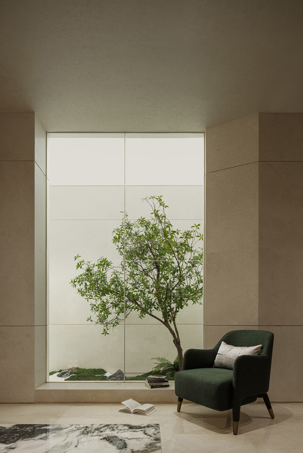 洽談區(qū)摒棄了繁雜的裝飾與構(gòu)造,轉(zhuǎn)而采用素色皮質(zhì)沙發(fā)軟裝搭配,營造簡約自然的氛圍。配合具有自然紋理的淡雅石面,雅趣橫生。