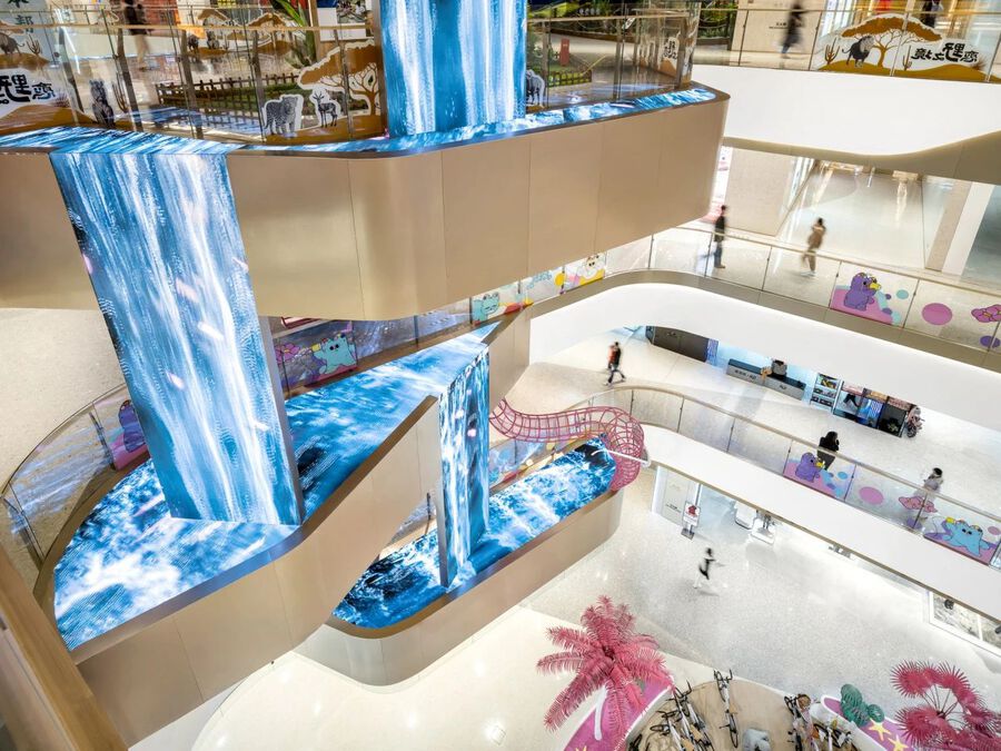 同時,在挑臺植入Led屏幕模塊,創造一道近20米的室內瀑布。這道瀑布連跨三層,傾瀉而下,為整個空間注入強烈的動感,營造出一種震撼人心的視覺體驗。