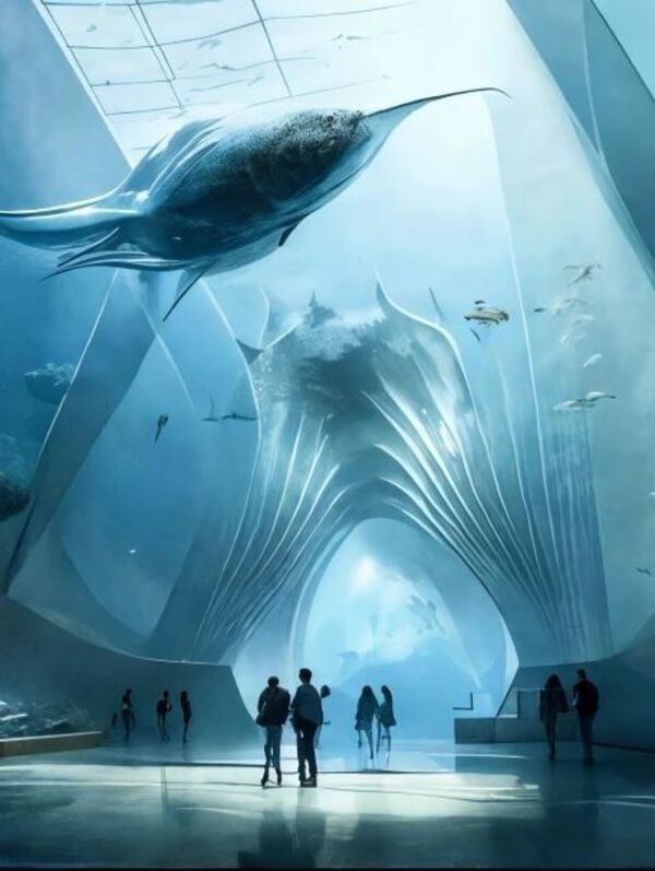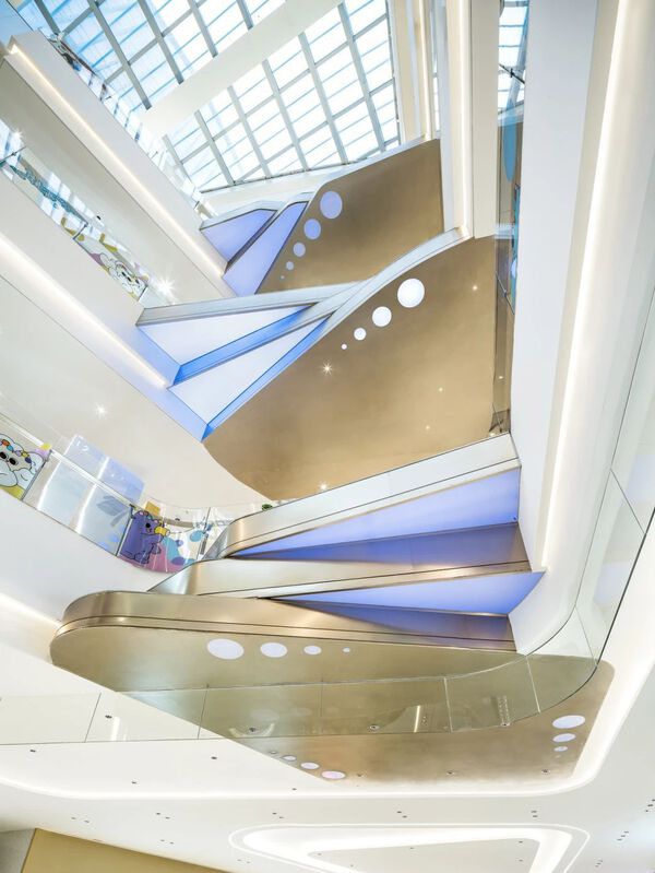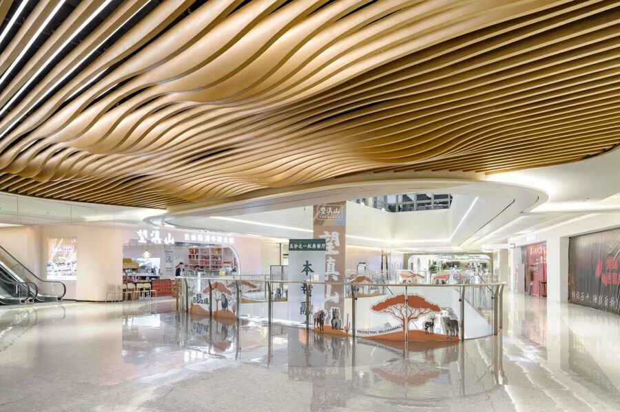 引用海螺封存海浪回音的美好傳說,J&A在西中庭的天花造型上引入海螺紋理,配合屏幕動畫打造洋流與鯨魚共舞,海陸空間在此夢幻聯動的畫面。