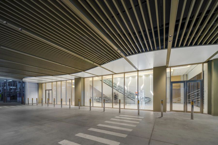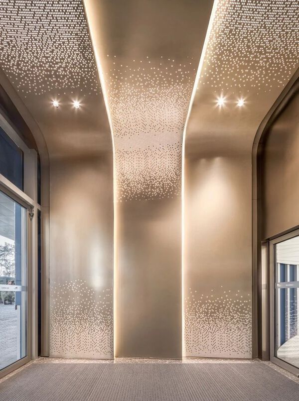 主入口延續建筑外觀的流線型設計,夜幕降臨后,數百根金色鋁管在燈光照射下熠熠生輝,為入口增加了韻律感與層次感。