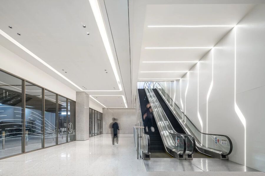 對于商業空間來說,反復的視覺符號植入可以幫助商場構建鮮明的商業辨識度。J&A在常被忽略的地下光廳、電梯廳等區域同樣也嵌入海浪線條,從而形成連貫統一的視覺感受。