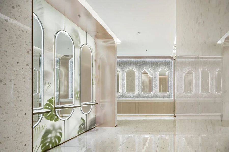 J&A打破大眾對衛生間的常規認知,為顧客帶來全新的敘事空間與情緒感受。在女衛洗手臺區域,墻面以波浪紋理的灰色人造石為裝飾,化妝臺墻面則使用了高清圖案的藝術玻璃,恍惚置身于自然之中。