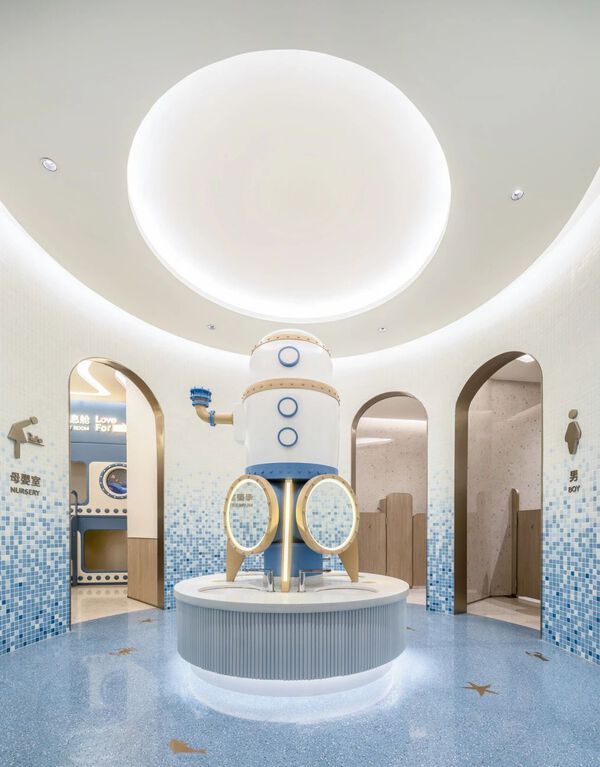 兒童衛生間的弧形墻面為孩子們提供了充足的安全感。還有各種可愛的設計元素,比如洗手臺上的卡通潛艇、墻面藍白漸變的小馬賽克瓷磚、地面的海洋生物圖案,都在激發著孩子們探索海洋的興趣。