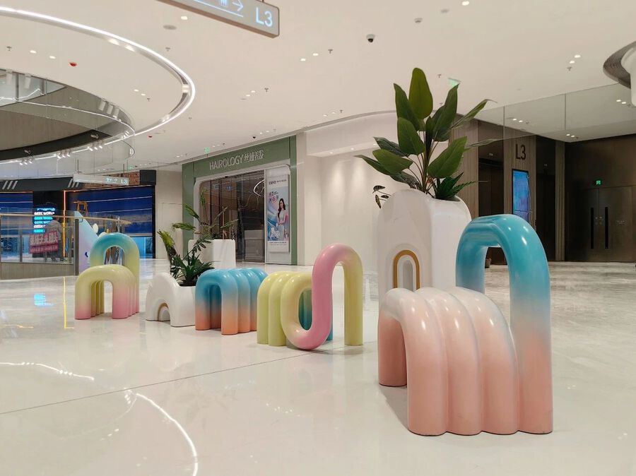 在親子友好層的休息區設計上,J&A以花瓣的層疊和色彩為靈感,將漸變色與圓潤造型相結合,精心打造了一個獨具特色的兒童休息區,讓孩子們樂在其中。