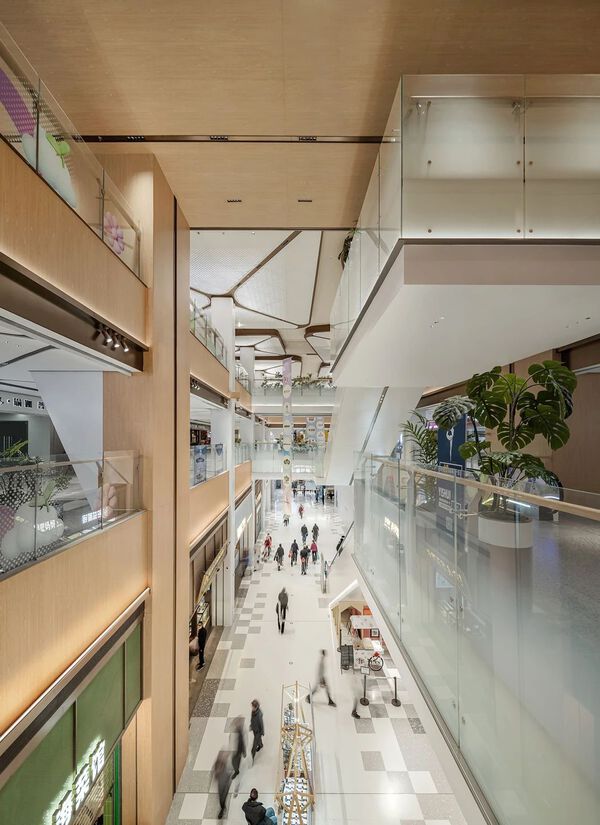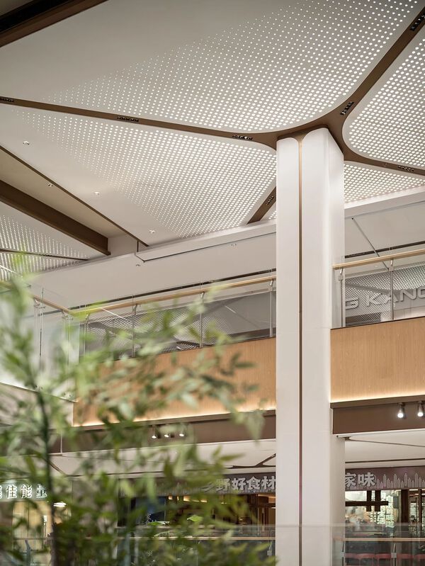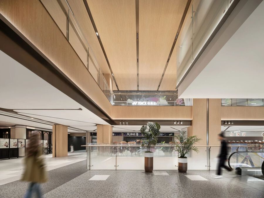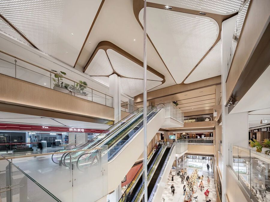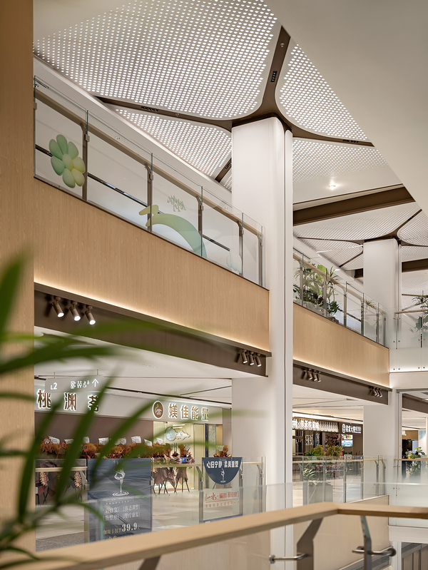 中庭區域原本層高較低,為營造漫步林中的購物體驗。設計團隊通過模擬樹冠的簇擁和樹干的序列,打造生態雨林般的中庭空間。