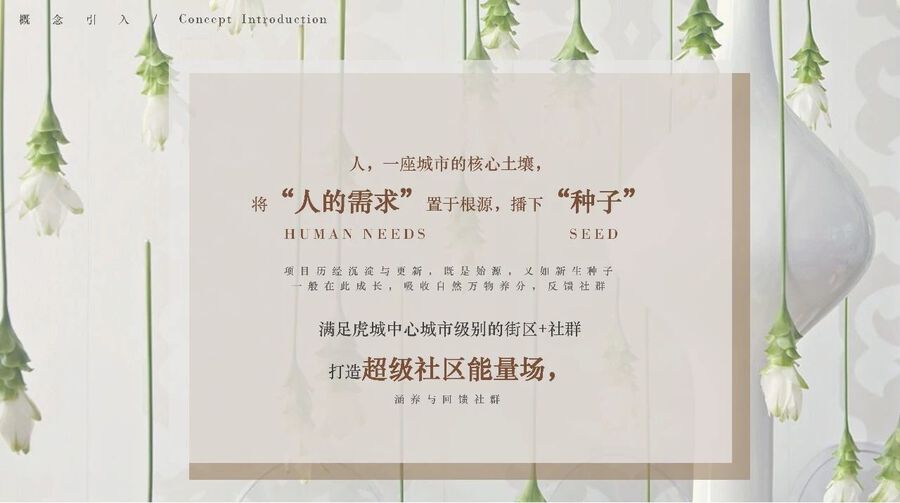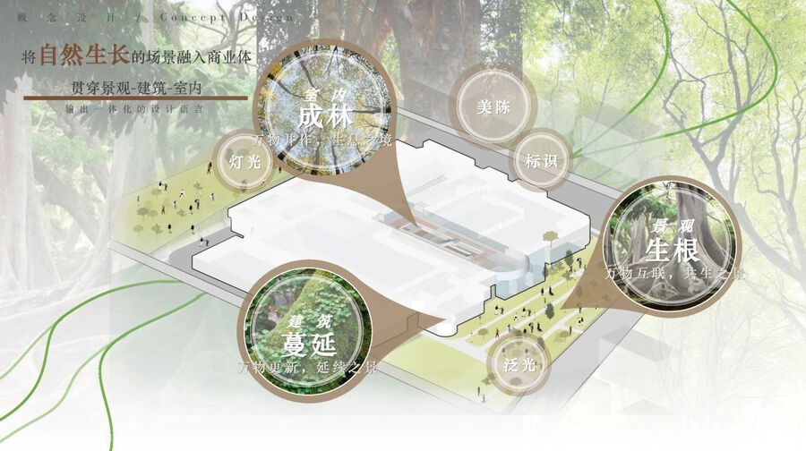 基于以上種種思索,J&A以“核心土壤的根源——種子”為核心概念,將種子的生長過程 “生根-蔓延-成林”融入景觀、建筑和室內設計中,形成統一的設計語言。圍繞社交、文化、 健康、友好、親近和服務等核心詞匯,致力于在5.5萬㎡的空間內打造一個超級社區活力中心。