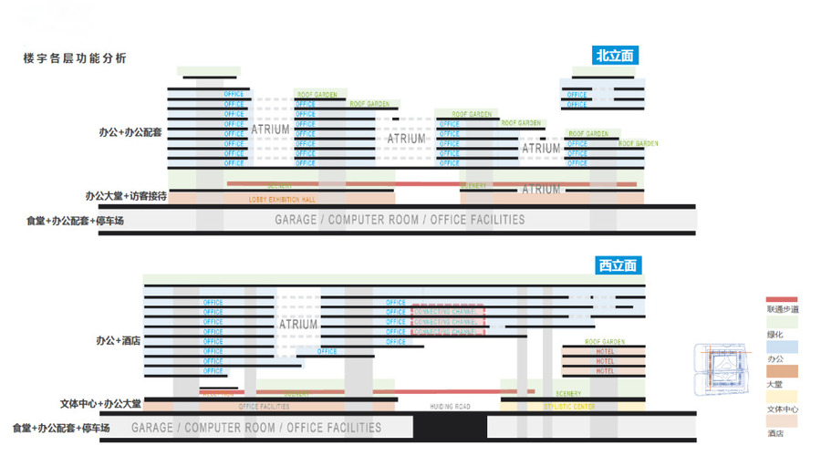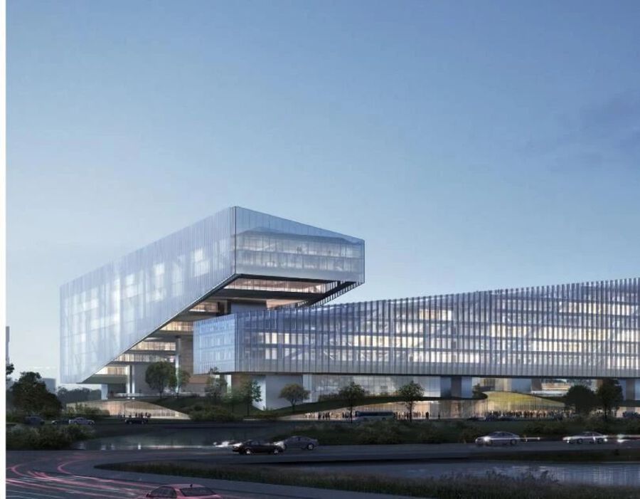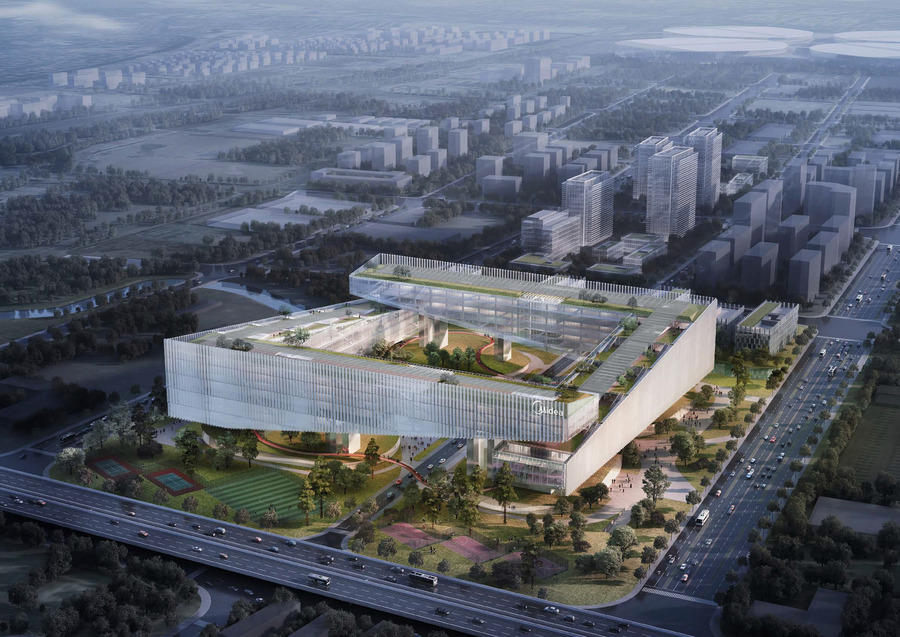 項目建筑面積約40萬㎡,建筑把主體的研發辦公與酒店功能緩緩抬升,設置于南北兩個地塊,同時于地景裙房之上,L型體型分別向南北延伸,形成相互交疊的空間形態。