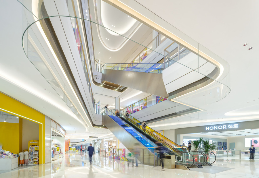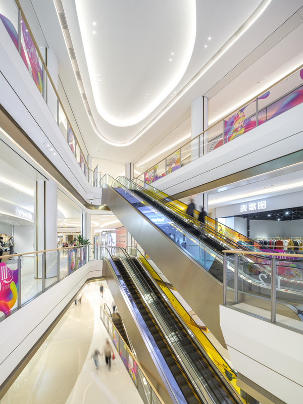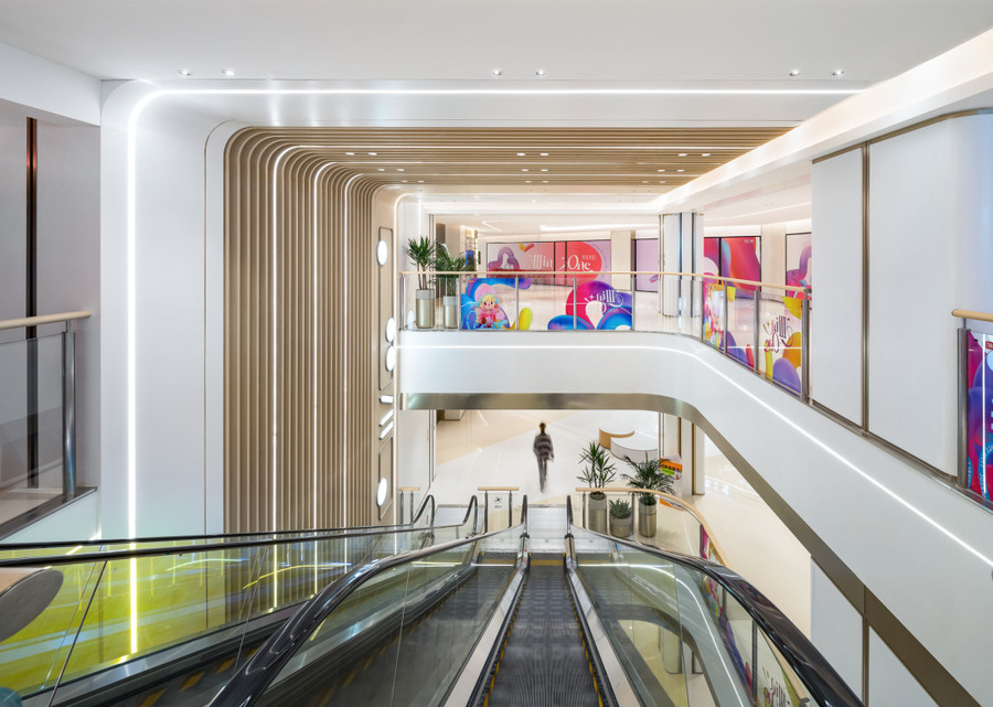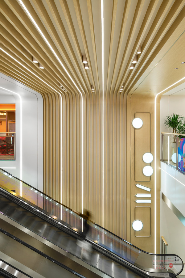 扶梯內嵌于店鋪之間,通過包裹式的設計優化周邊實墻的視覺感受,同時顯著提升了扶梯入口的昭示性。