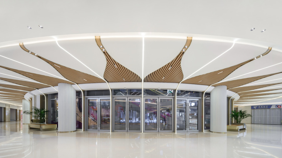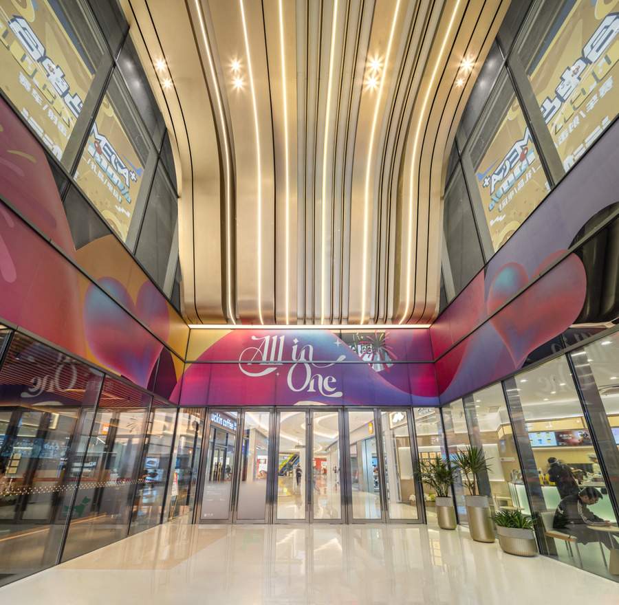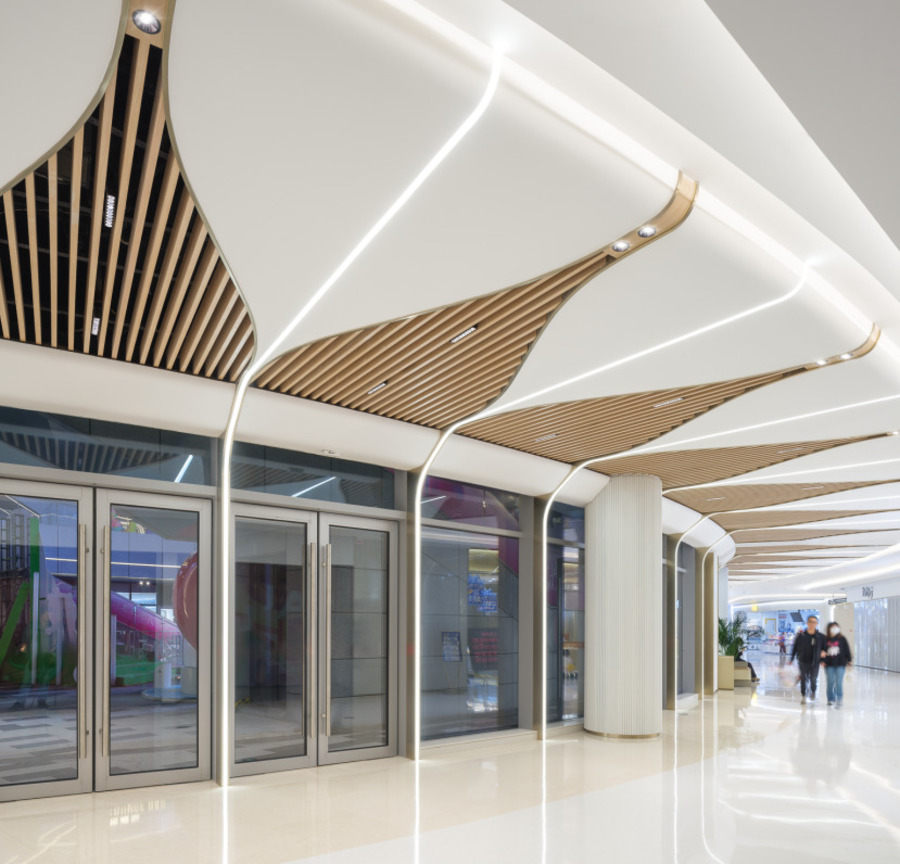 天花造型的傾斜度巧妙設計為盡量垂直于人的視線方向,最大程度優化了入口處的商業展示效果。