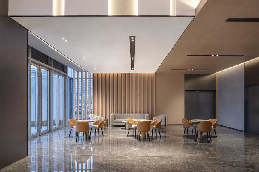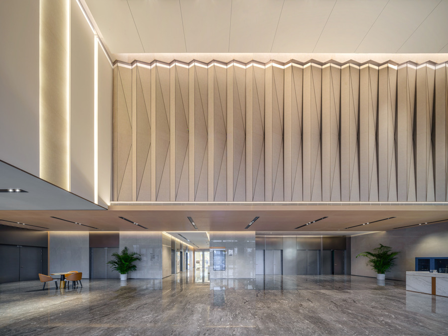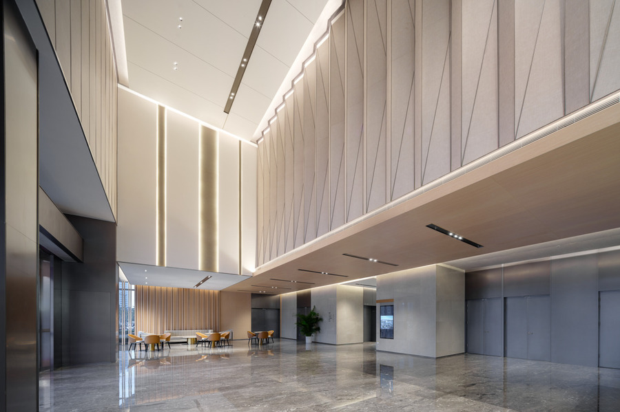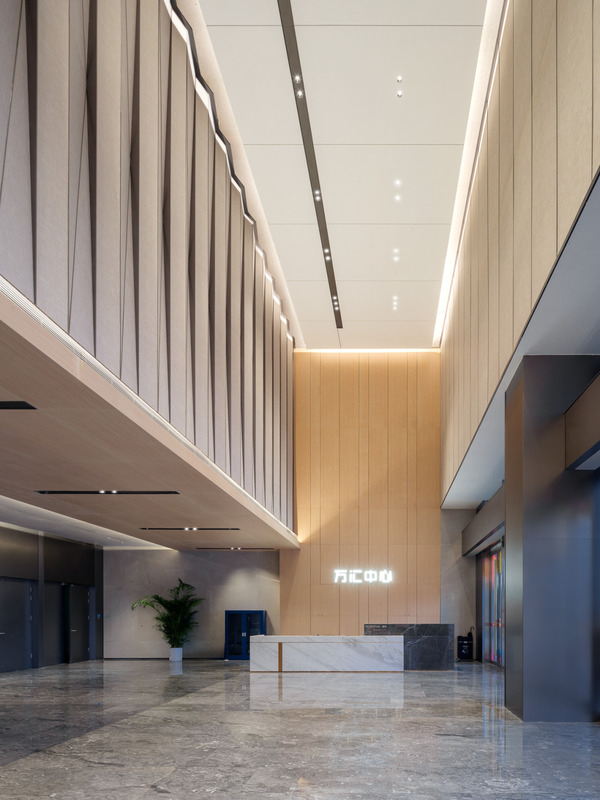 萬匯中心延續整體調性,在辦公大堂營造高效、專業且不失質感的商務氛圍,滿足企業形象與員工體驗的雙重需求。